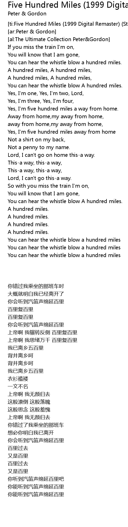 Five Hundred Miles Lyrics / Five hundred miles is a genre song and five. Five Hundred Miles Lyrics - Five hundred miles from baltimore.